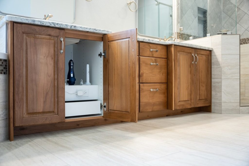 Optimizing storage and organization is always a great way to create a feeling of more space in any bathroom remodel. Most bathroom vanities have unutilized space below the sink which we addressed with custom cabinetry featuring pull out drawers, shelves, and plug ins. The updated design allows for decluttered space and shows off the exquisite granite countertop these clients chose.